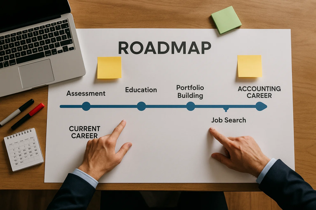 Many successful career changers maintain their current roles while building accounting credentials, only switching after securing new positions.
